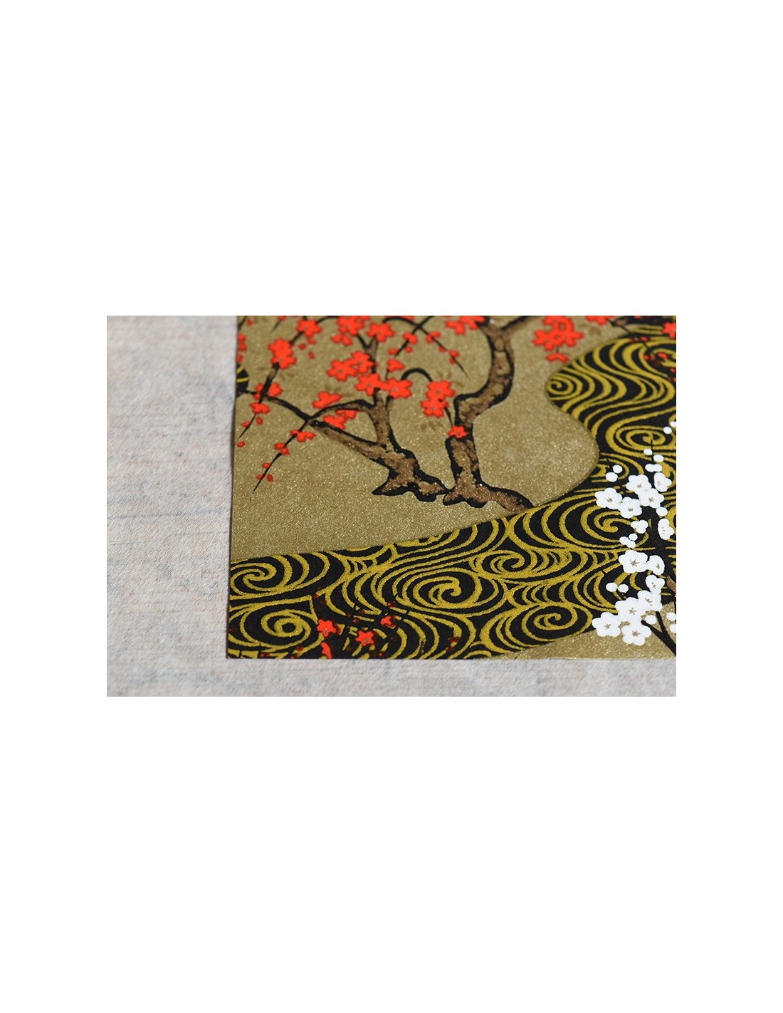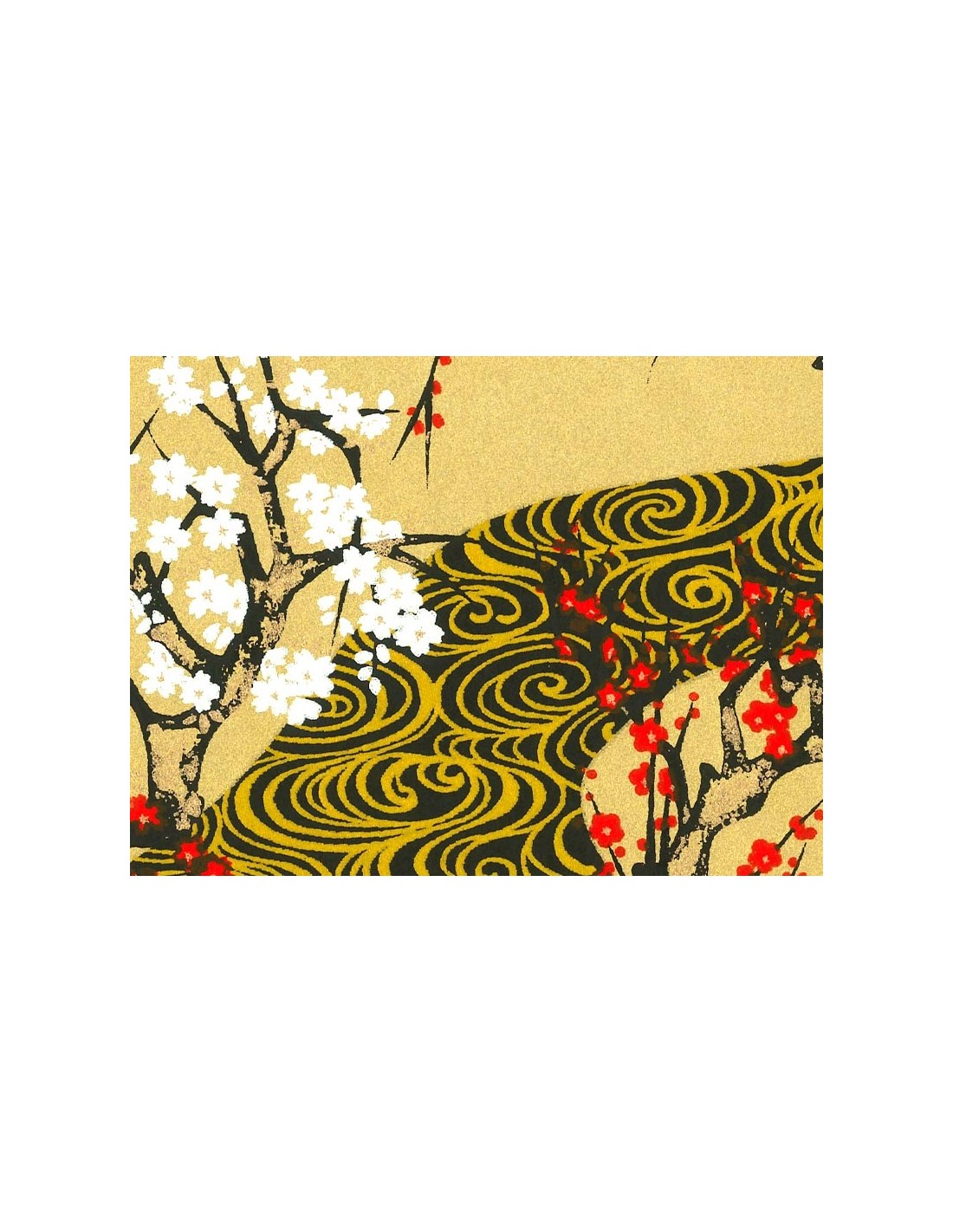 Il disegno raffigura un impressionante flusso d'acqua tra susini bianchi e rossi e fiori di ciliegio.