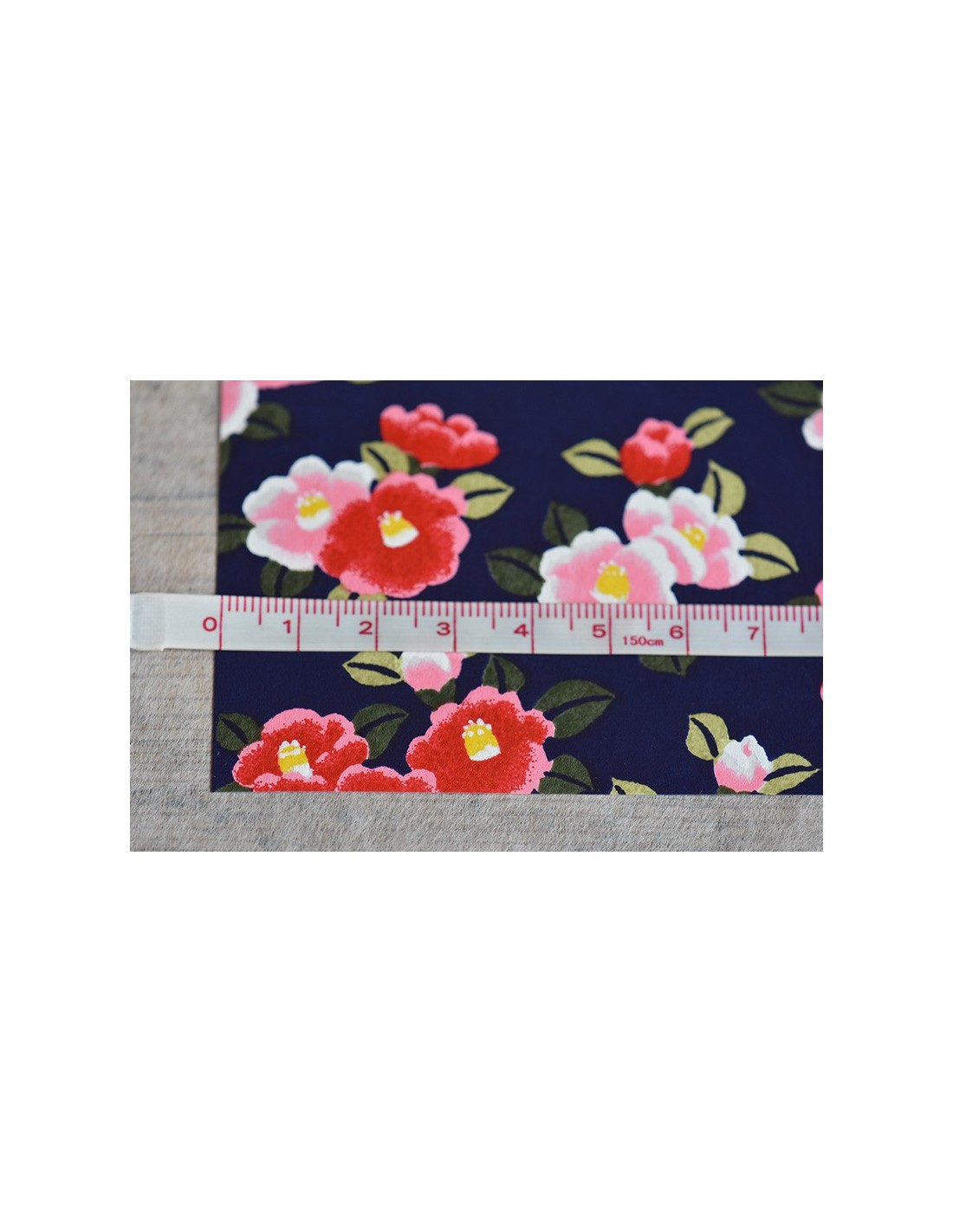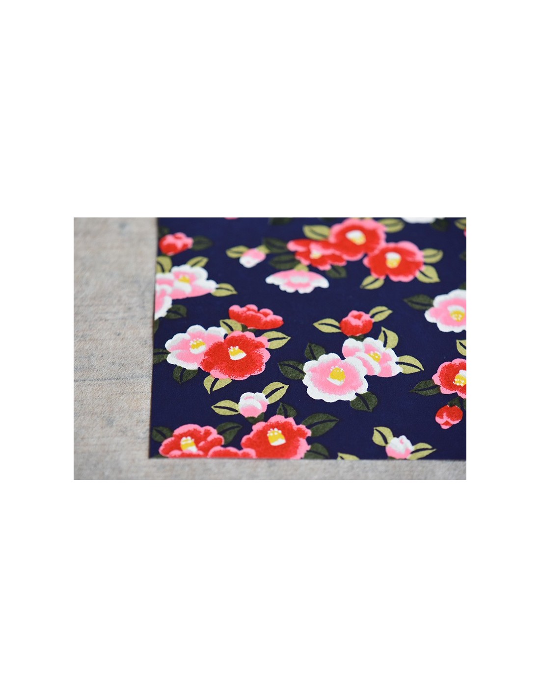 Un motivo chic con camelie rosse e rosa disegnate su uno sfondo blu scuro.