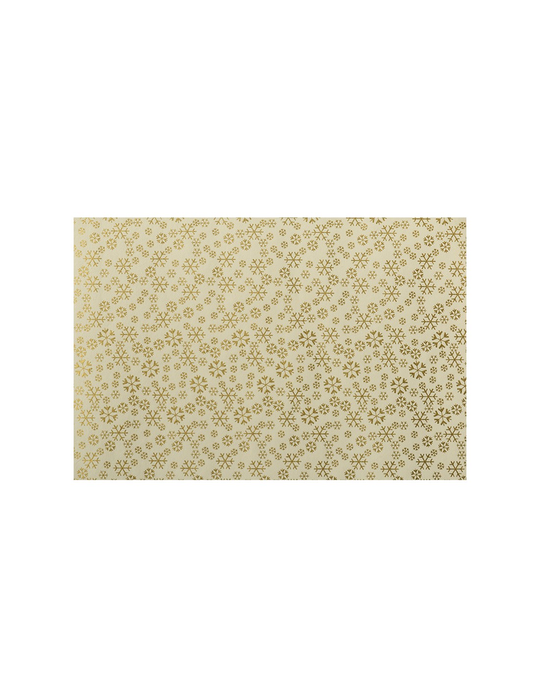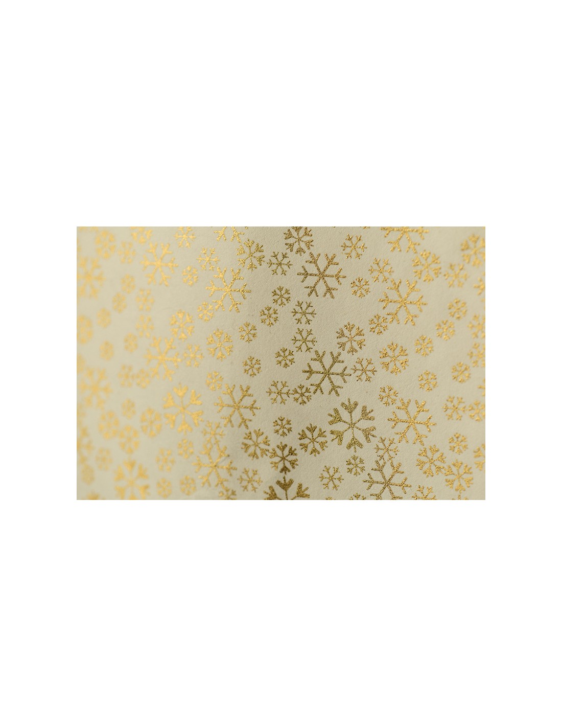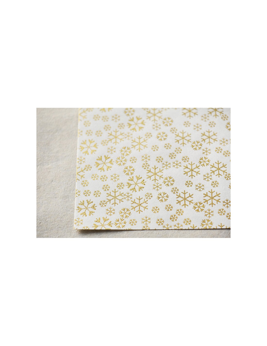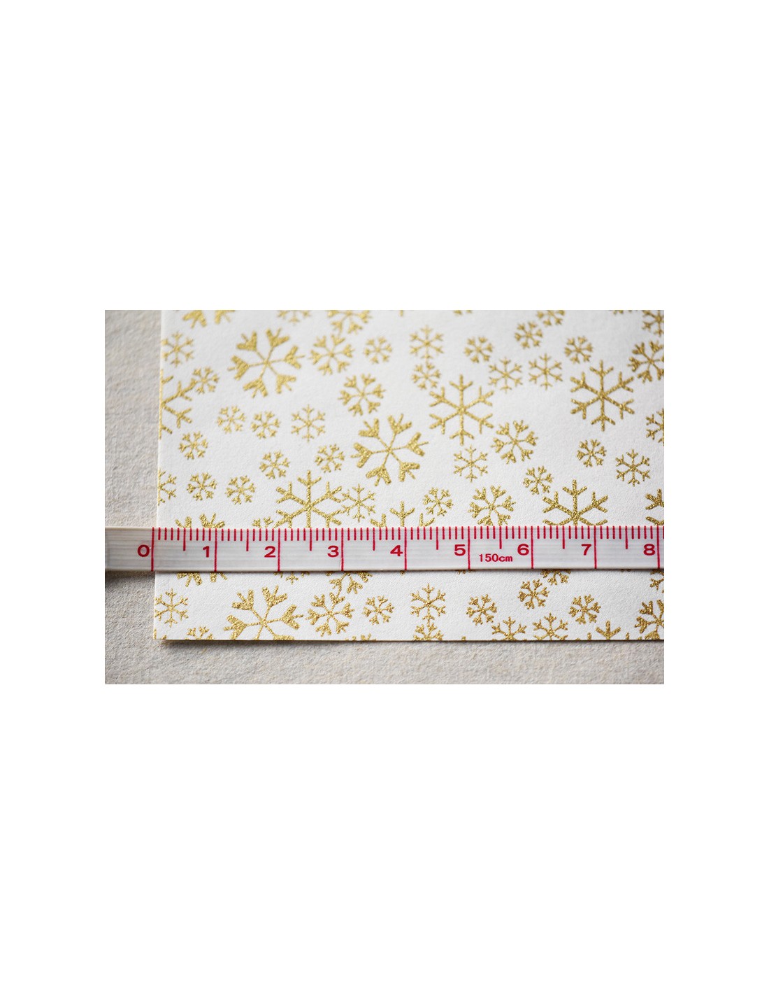 Fiocchi di neve di diverse dimensioni sono dipinti su tutta la superficie in oro su sfondo bianco.