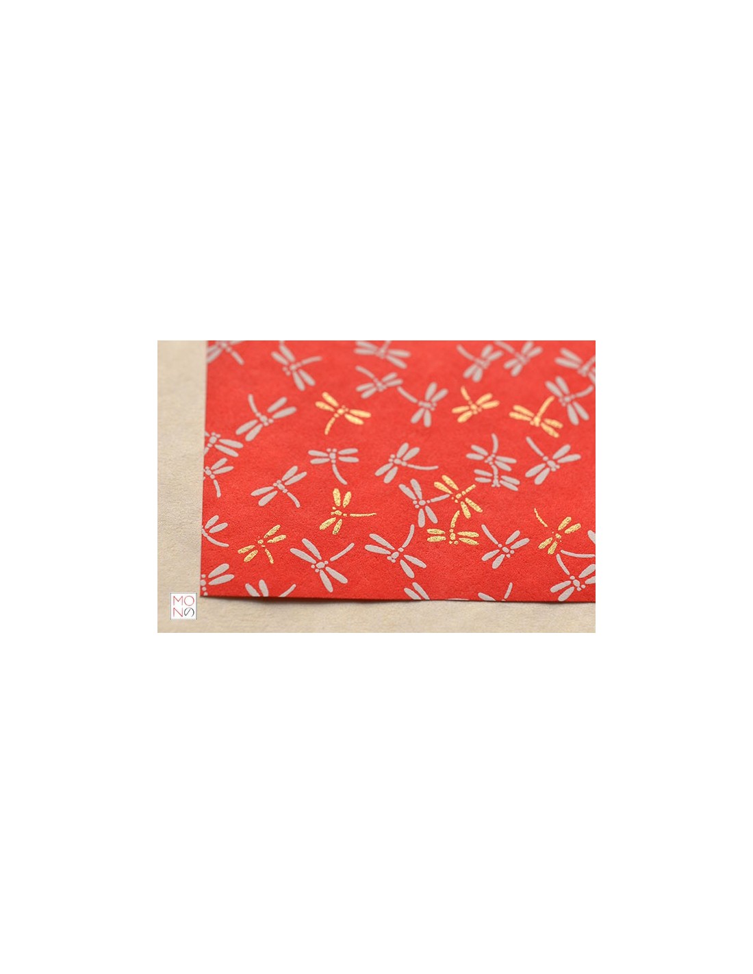 È un disegno che dà un senso di movimento, come se libellule bianche e dorate volassero in cerchio o serpeggiassero su uno sfondo rosso.