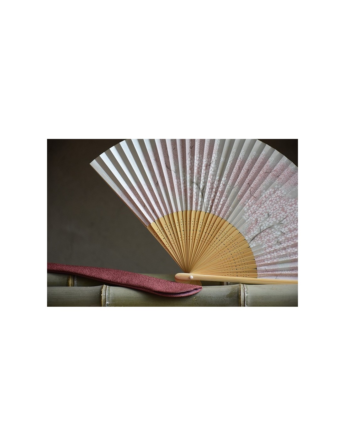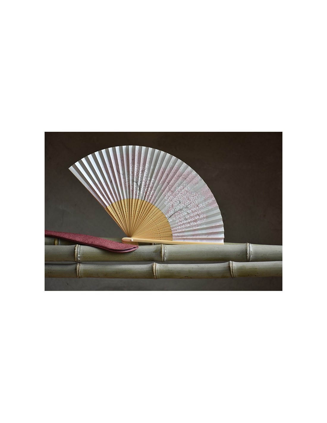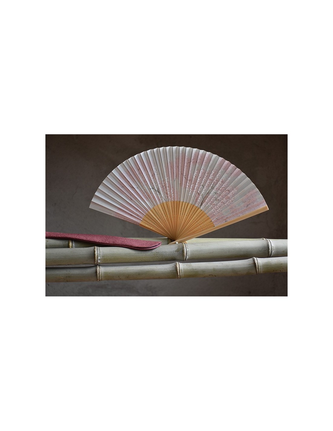 Il ventaglio è accompagnato da una custodia in tessuto Chirimen di colore rosa.