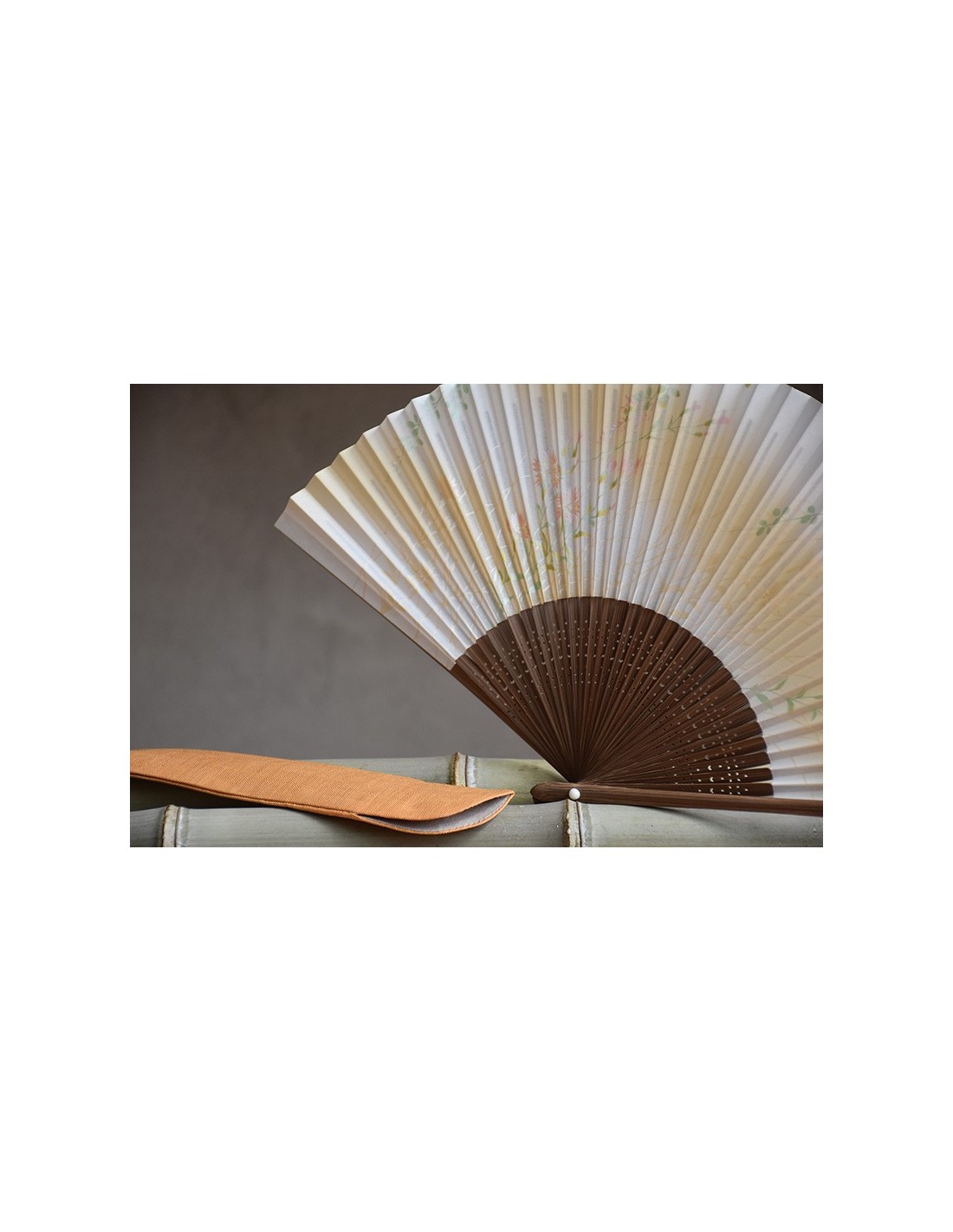 Il ventaglio è accompagnato da una custodia in tessuto di lino giallo ocra.
