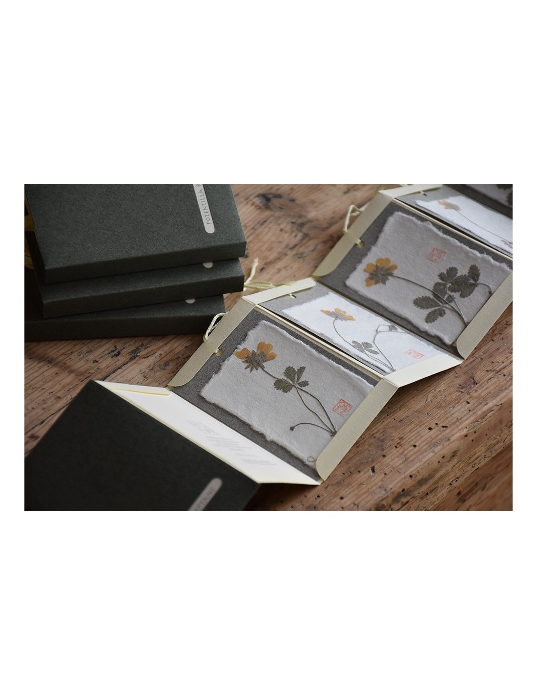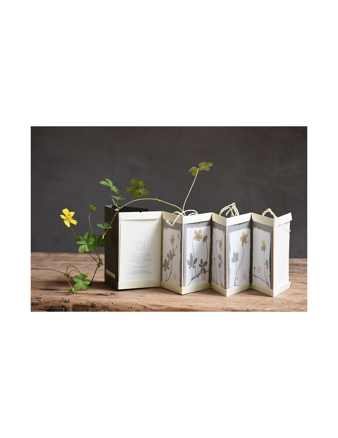Ogni tag è realizzata con diversi strati di carte tra cui un velo di carta giapponese che riveste il fiore o la pianta utilizzati.