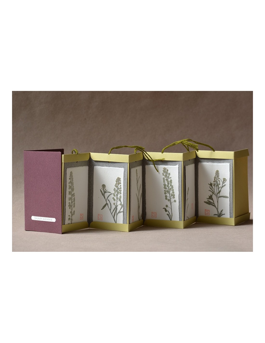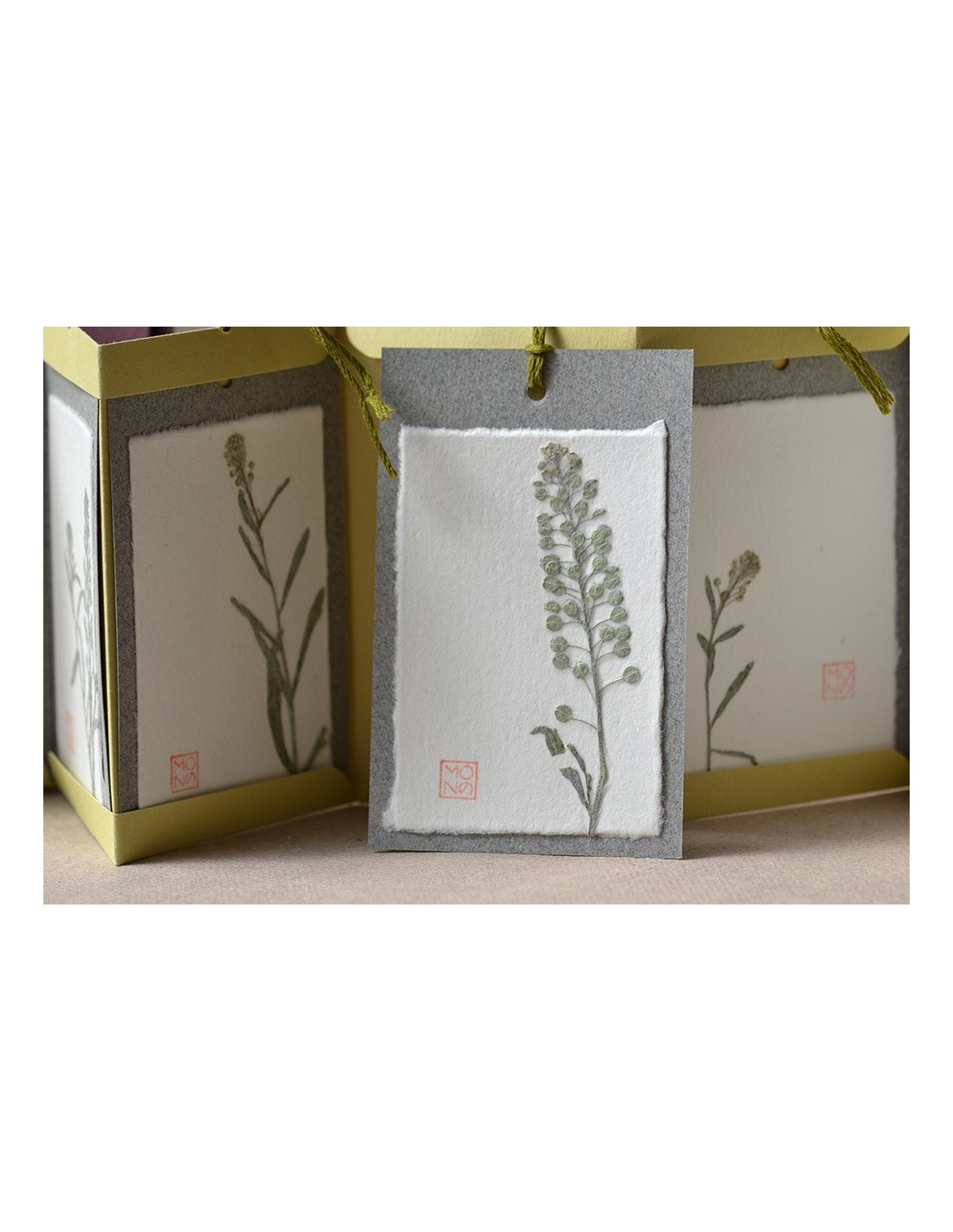 Ogni tag è realizzata con diversi strati di carte tra cui un velo di carta giapponese che riveste il fiore o la pianta utilizzati.