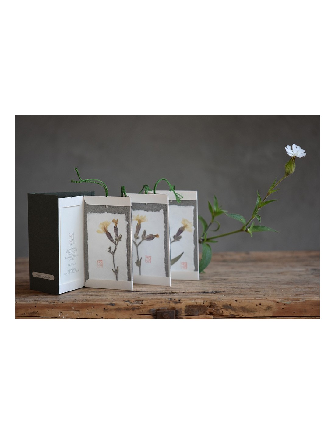 Ogni tag è realizzata con diversi strati di carte tra cui un velo di carta giapponese che riveste il fiore o la pianta utilizzati.