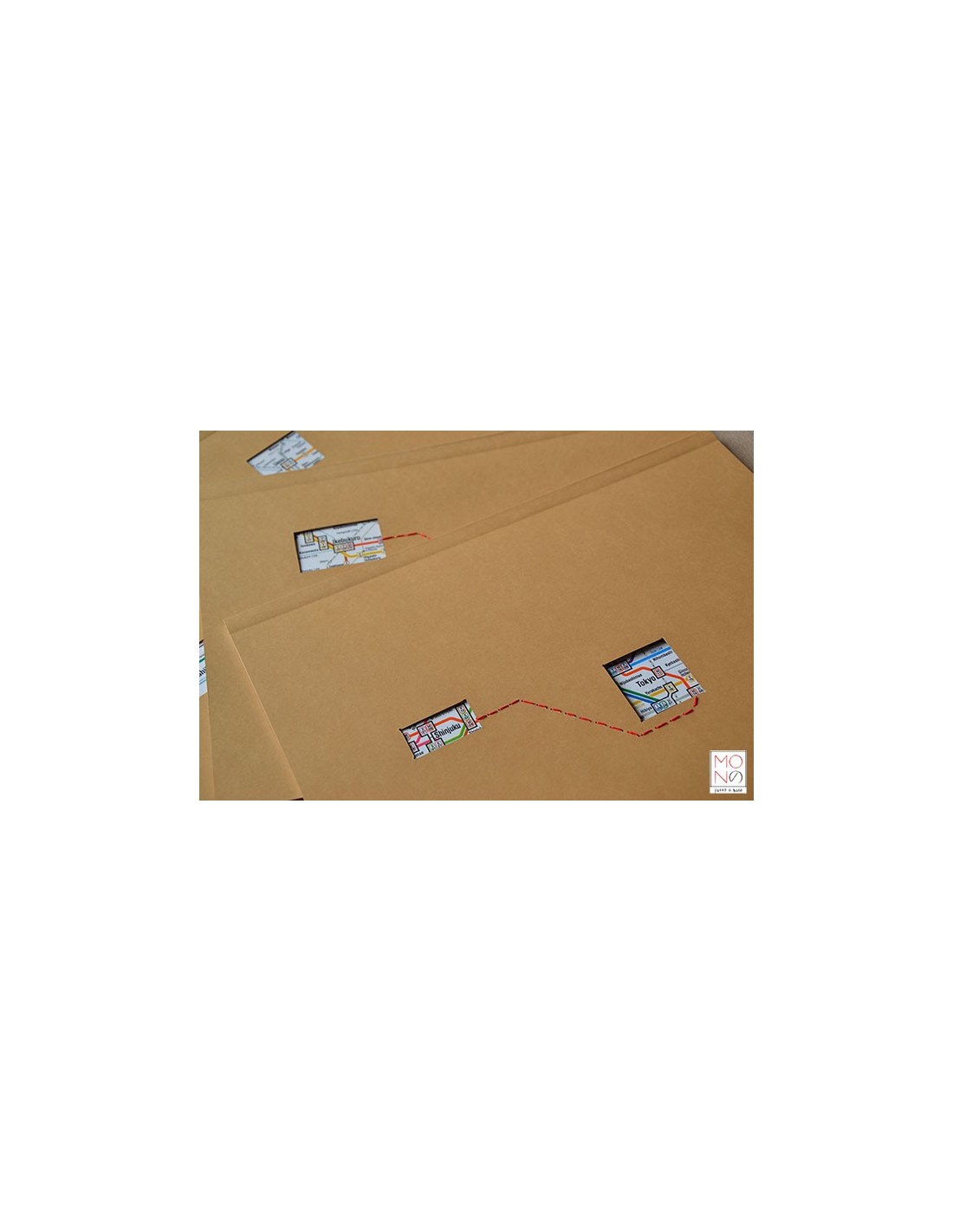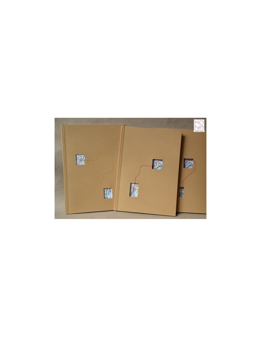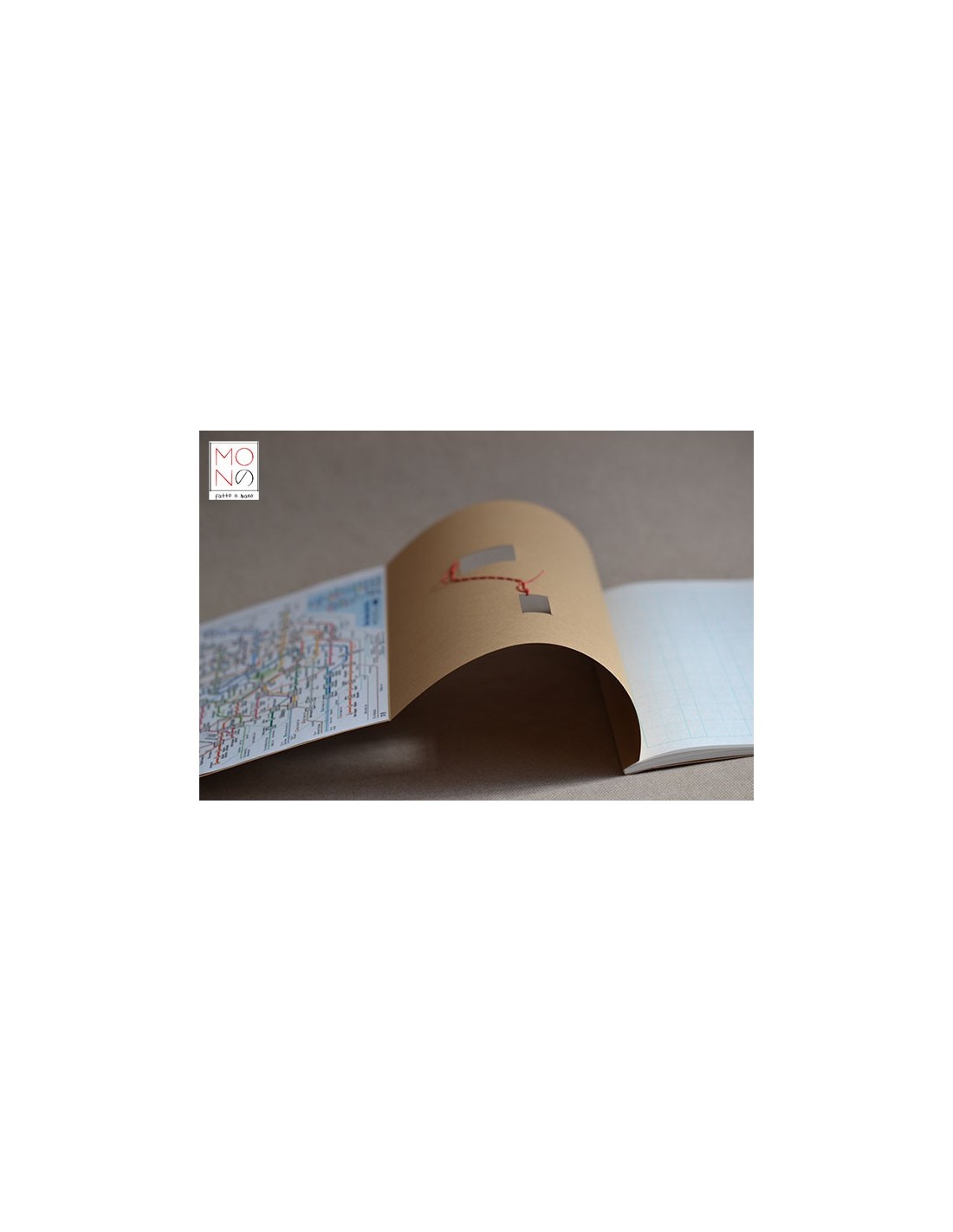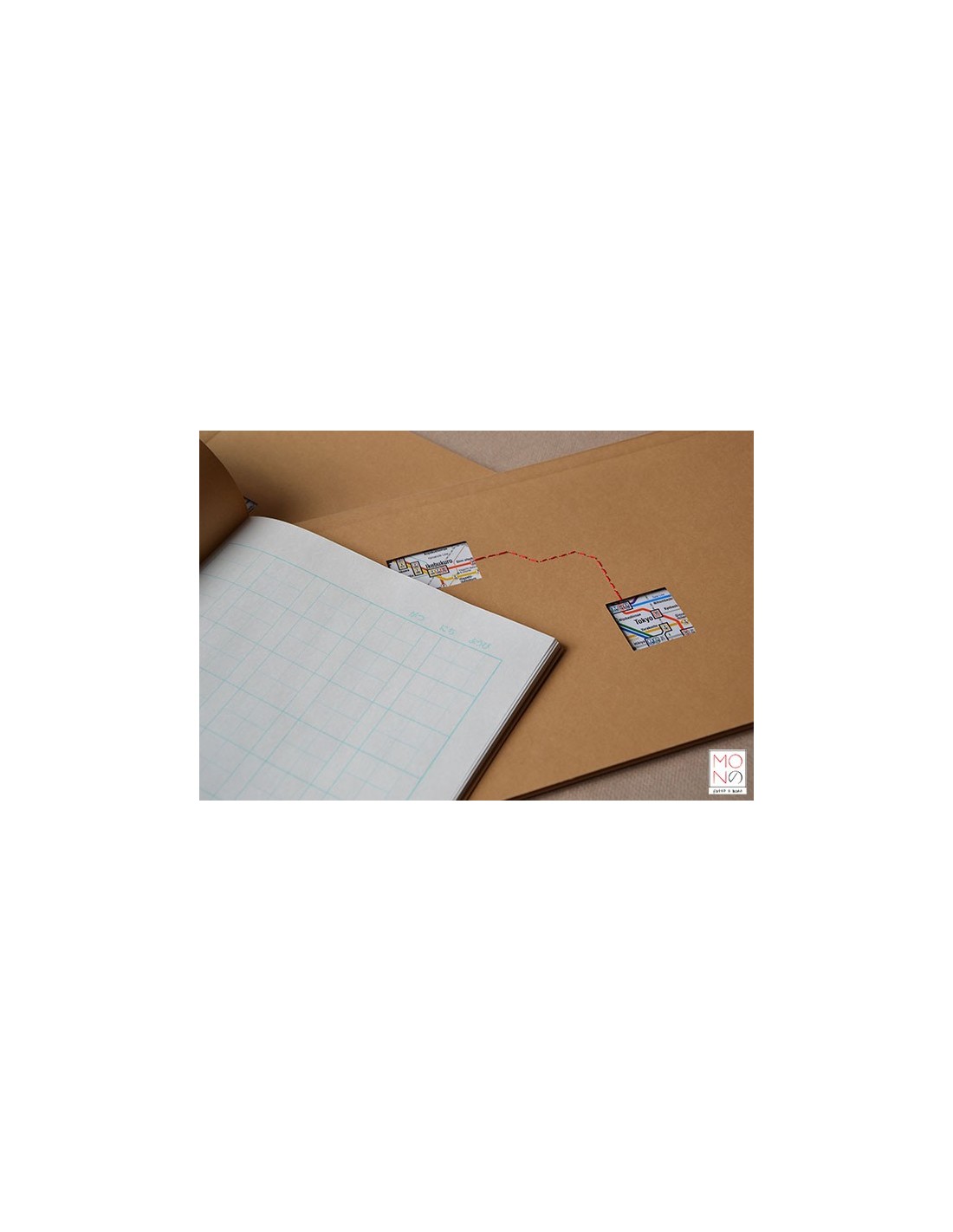 Copertina in cartoncino con interventi di cucitura e riproduzione della mappa metrò Tokyo
