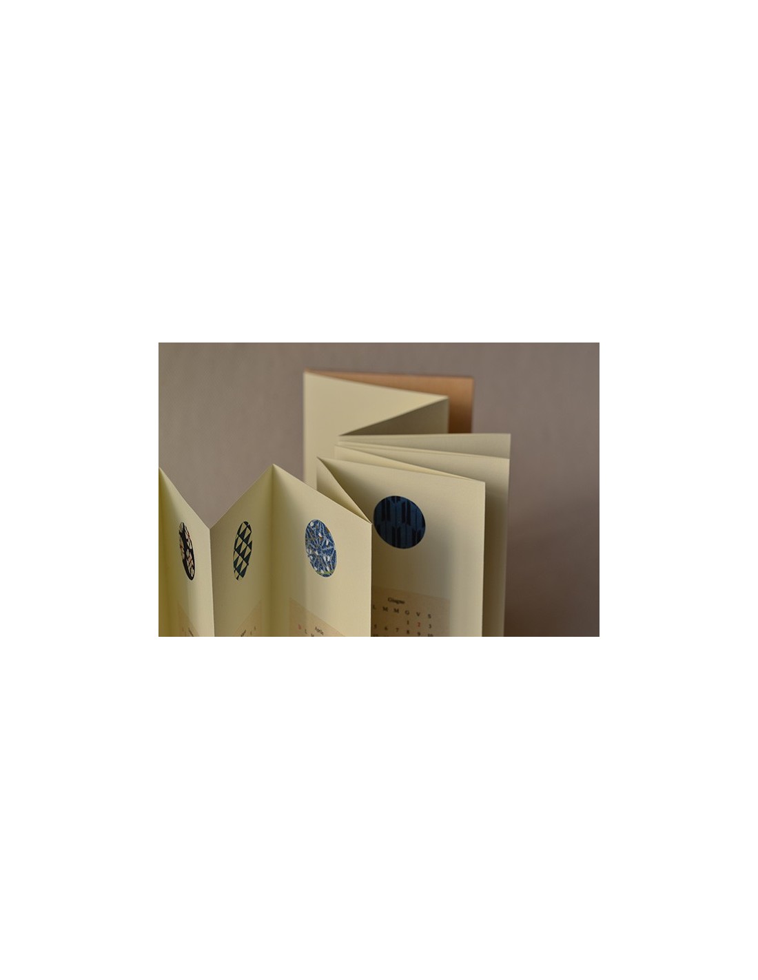 Struttura a concertina con inserti in carta chiyogami e piatti in legno.